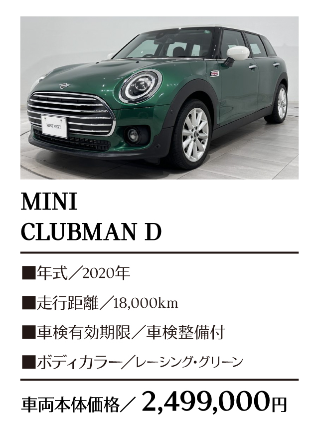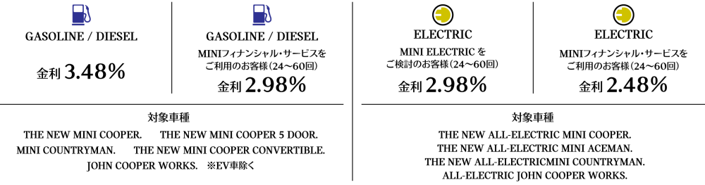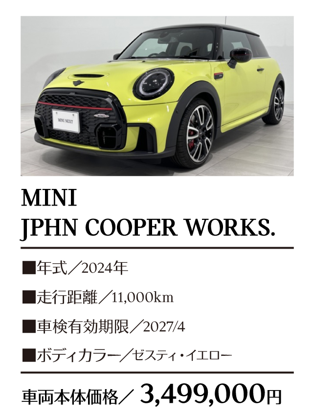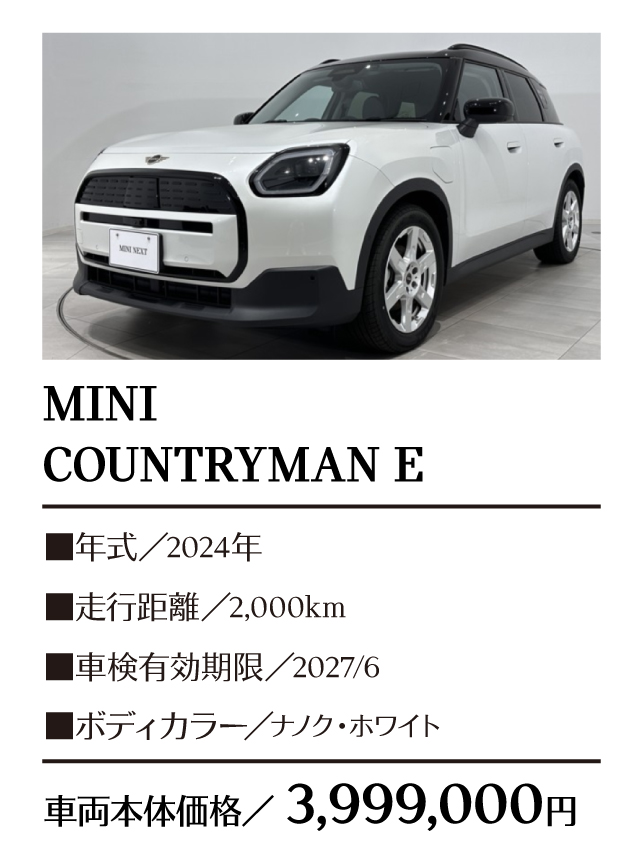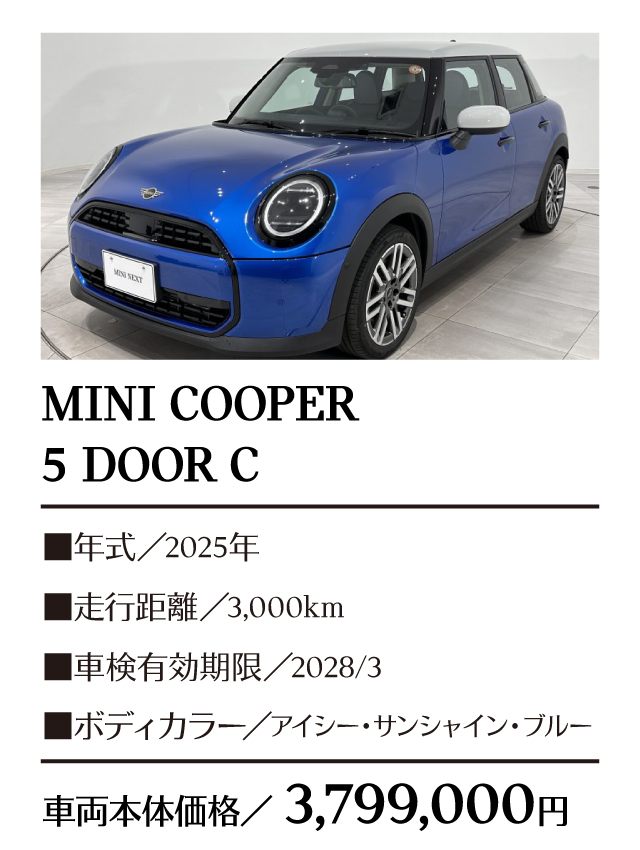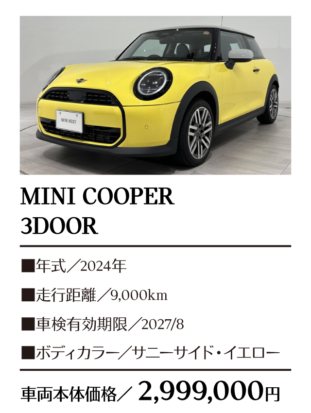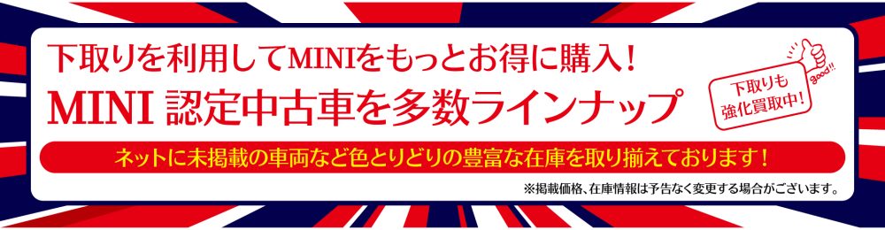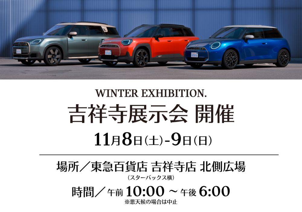 2025年 11月のお知らせ 2025.10.22 ニュース 11月8日(土)・9日(日)の2日間、吉祥寺にてMINI出張展示会を東急百貨店 吉祥寺店 北側広場(スターバックス横)にて開催いたします。 個性あふれるMINIラインアップを、ぜひこの機会に間近でご覧ください。 皆さまのご来場を心よりお待ちしております。 2025年12月31日までに受注いただけるお客様へ、特別金利の購入サポートをご用意いたしました。 対象車両やご条件などの詳細は、MINI NISHI-TOKYO もしくは MINI SUGINAMI までお気軽にお問合せください。 ※ THE NEW MINI COOPER CONVERTIBLE.を除きます※ 金利とは割賦販売法で定める手数料率を指し、実質年率です。 ※ 以上の内容は予告なく変更、終了する場合がございます。また、他のサポート等との併用ができない場合もございます。