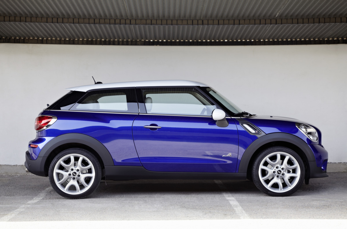 ミニペースマン(R61)は2013年3月に発売された、ミニ初のクーペSUVモデルです。一見するとミニクロスオーバーから後部のドアを取り去っただけのモデルと思えますが、ミニペースマン独自の工夫も凝らされています。ミニペースマンのデザインで注目すべきなのは、リアに向かうほど下がってくるルーフラインです。サイドウインドー下部から車体後部に流れるショルダーラインはルーフラインと対照的に後ろ上がりになっており、リアがコンパクトに見えるようにデザインされています。ペースマンとクロスオーバーはボディサイズの数値上はほぼ違いはないのですが、ペースマンの方がエッジが利いてコンパクトに見えるのにはこういったデザインが影響しています。