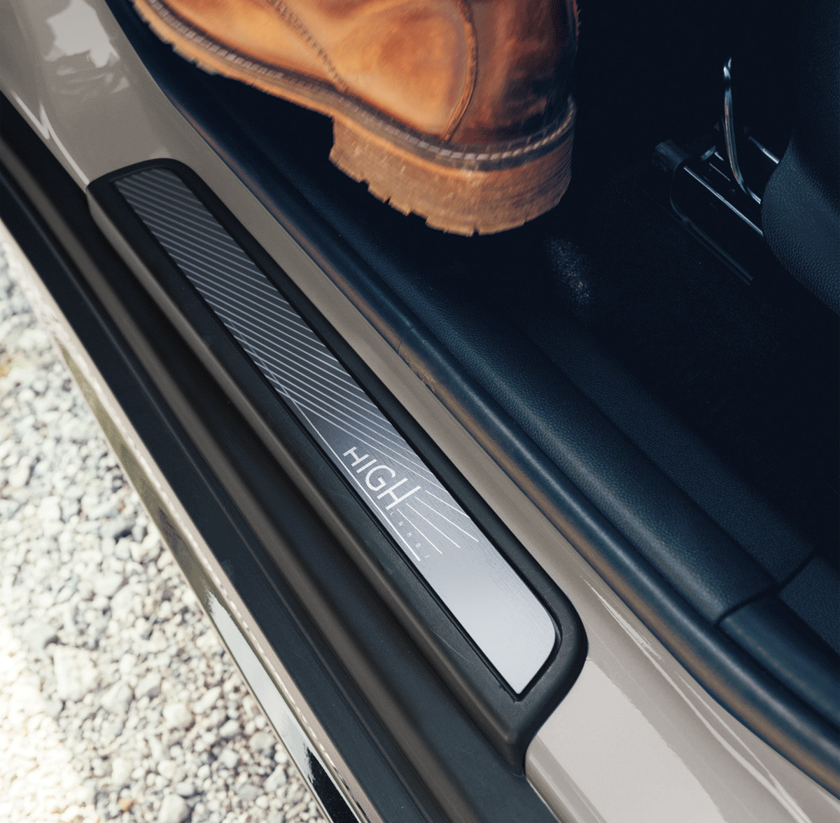 ホイールは、大型の 18 インチ・ピン・スポーク・ブラックを採用し、ピアノ・ブラック・エクステリア、ハイグロス・ブラック・ルーフレールなどのブラック・エレメンツと共に、エクステリアをスタイリッシュに引き締めています。サイド・スカットルは、Highlands Edition 専用に開発されたスコットランドのハイランド地方の地図をモチーフとしたユニークなデザインであり、運転席側と助手席側でデザインが異なる特別仕様となっています。