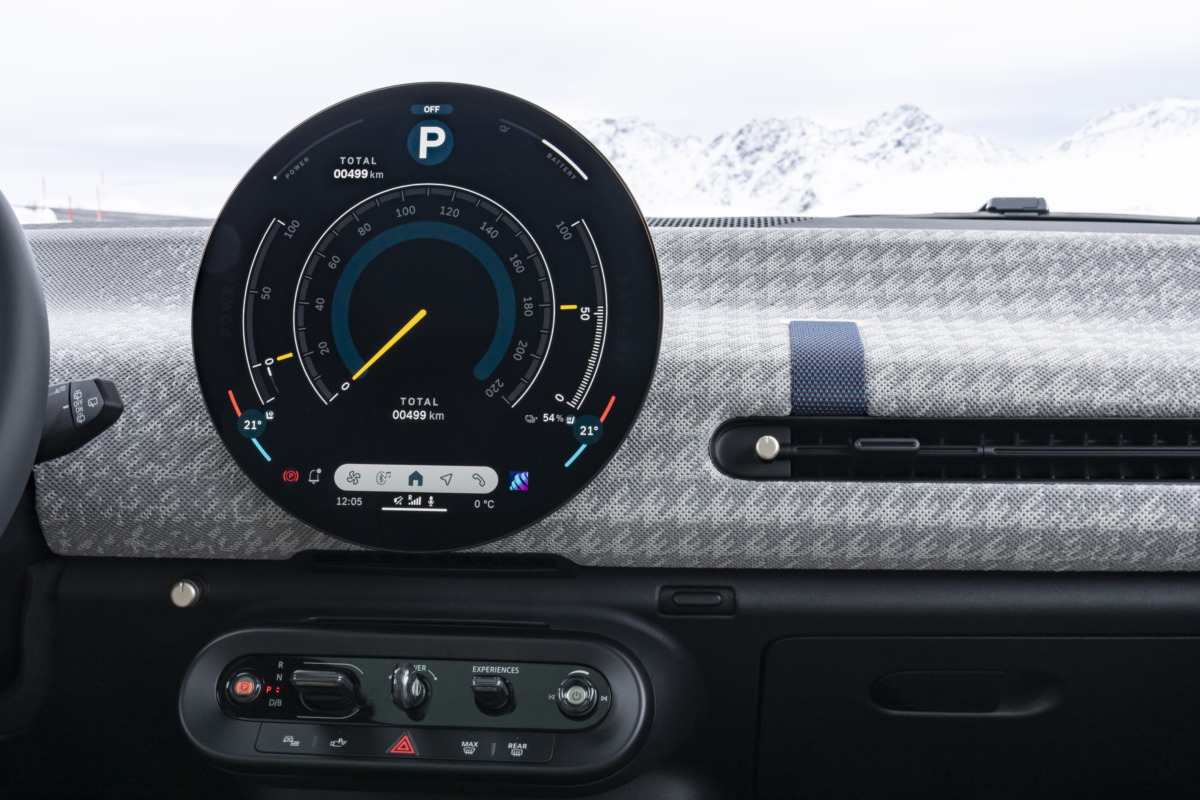 有機ELディスプレイ下に配置された5つのトグル・スイッチは、パーキング・ブレーキ、ギア・セレクター、スタート/ストップ・キー、エクスペリエンス・モード・トグル、ボリューム・コントロールの機能を担っています。少し前までのミニでは、より多くのトグル・スイッチが配置されており「飛行機のコクピットみたいだ」と言われていましたが、この数年でMINIのダッシュボード周辺のデザインも大きく進化しましたね。